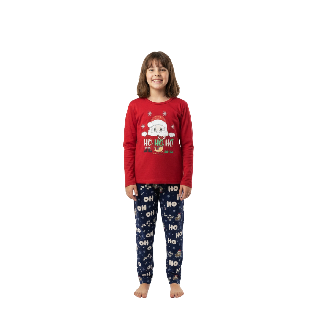 Pijama de navidad color roja con pantalón y manga larga con estampado de Paá Noel. 65% Poliéster 35% Algodón.