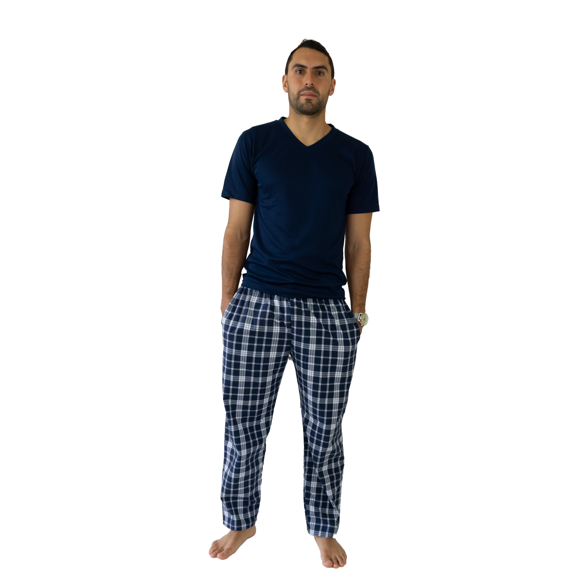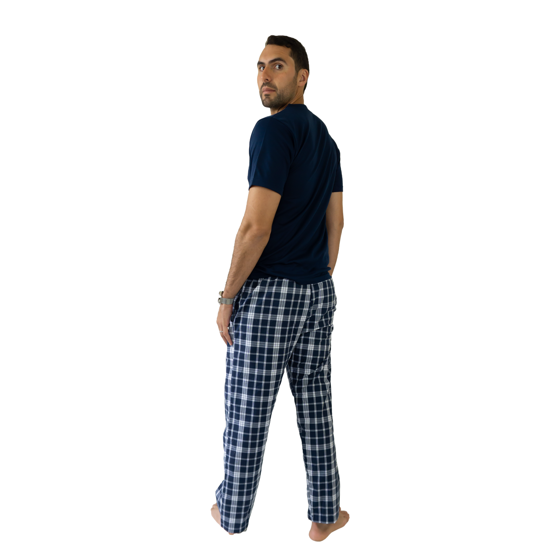 Pijama pantalón largo y camiseta. Pantalón: Tejido plano 70% Algodón 30% Poliéster // Camiseta: 65% Poliéster 35% Algodón. Estampado de cuadros en el pantalón.