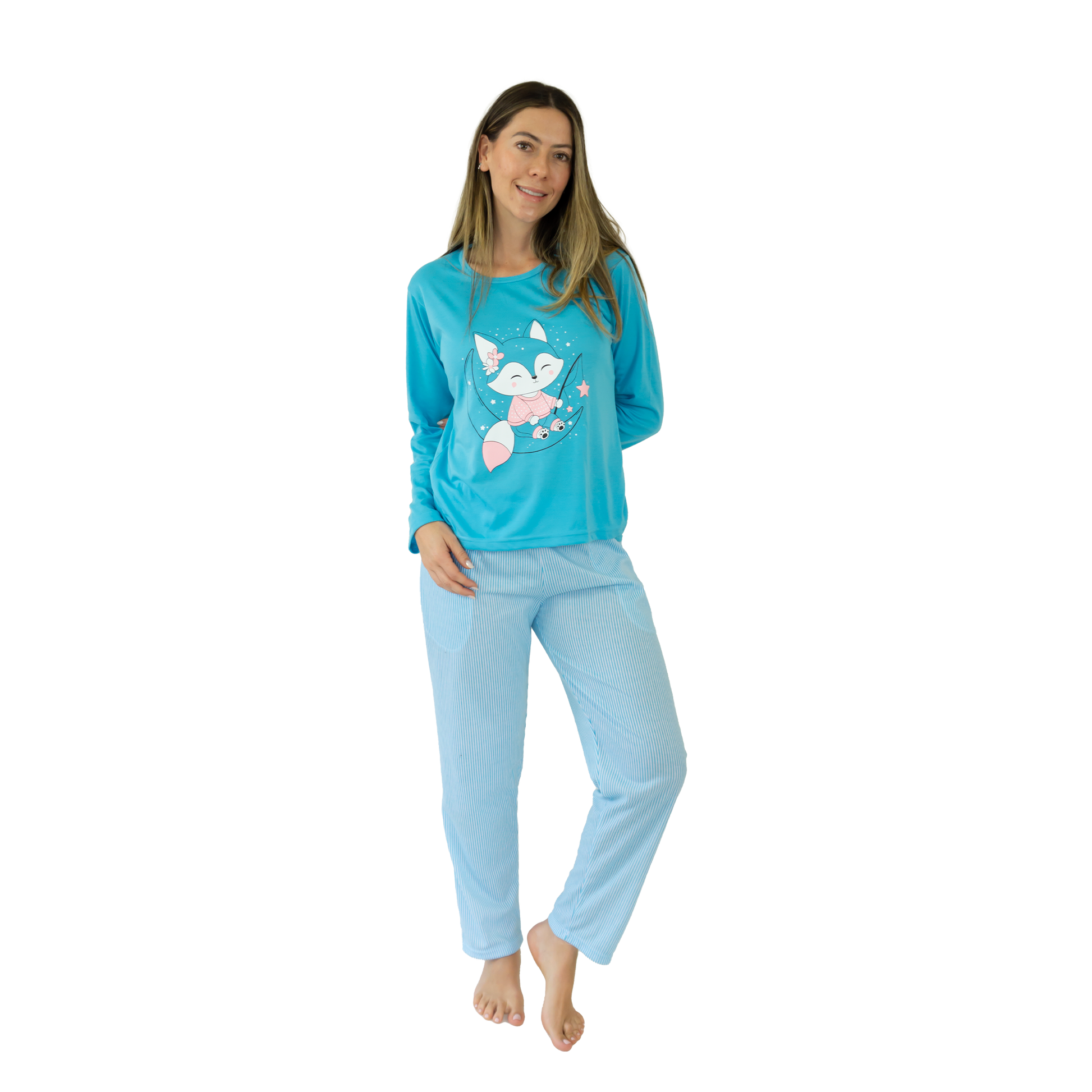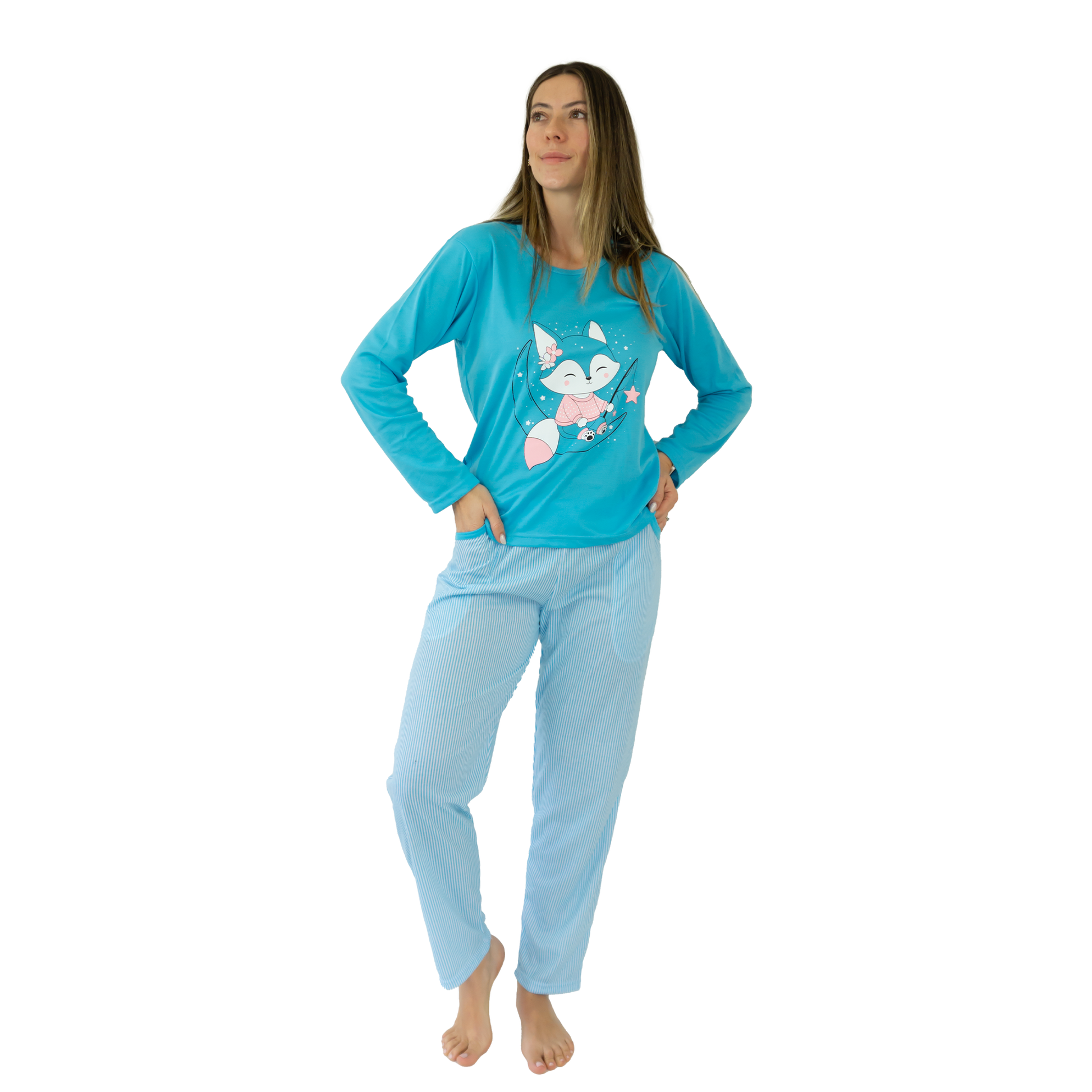 Pijama para mujer pantalón largo y camisa manga larga. 65% Poliéster 35% Algodón. Estampado de zorro o conejo en la camisa.
